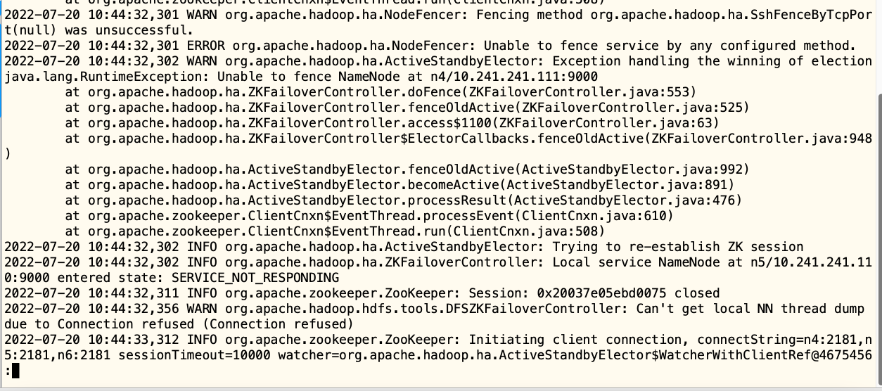 2022-07-20 10:44:32,302 WARN org.apache.hadoop.ha.ActiveStandbyElector: Exception handling the winning of election