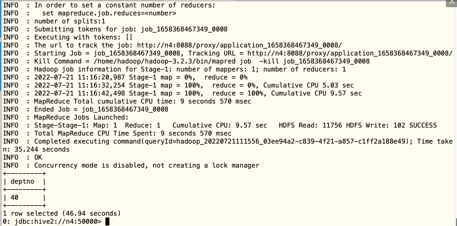 /home/hadoop/hadoop-3.2.3/etc/hadoop:/home/hadoop/hadoop-3.2.3/share/hadoop/common/lib/*:/home/hadoop/hadoop-3.2.3/share/hadoop/common/*:/home/hadoop/hadoop-3.2.3/share/hadoop/hdfs:/home/hadoop/hadoop-3.2.3/share/hadoop/hdfs/lib/*:/home/hadoop/hadoop-3.2.3/share/hadoop/hdfs/*:/home/hadoop/hadoop-3.2.3/share/hadoop/mapreduce/lib/*:/home/hadoop/hadoop-3.2.3/share/hadoop/mapreduce/*:/home/hadoop/hadoop-3.2.3/share/hadoop/yarn:/home/hadoop/hadoop-3.2.3/share/hadoop/yarn/lib/*:/home/hadoop/hadoop-3.2.3/share/hadoop/yarn/*将获取的classpath配置到yarn-site.xml中并重启yarn和hive服务