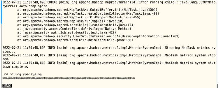 2022-07-21 11:09:48,808 ERROR [main] org.apache.hadoop.mapred.YarnChild: Error running child : java.lang.OutOfMemoryError: Java heap space