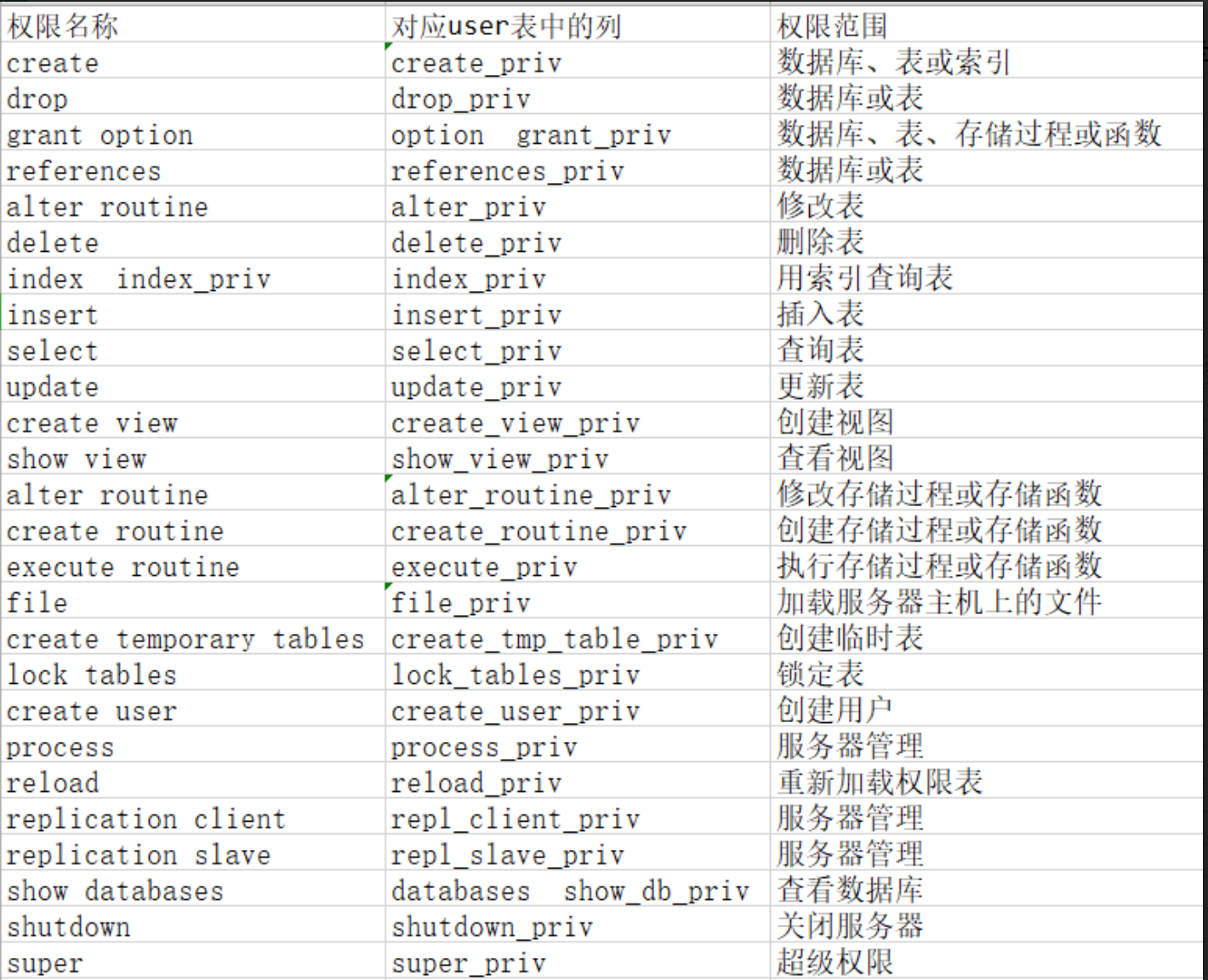 • 在这几个权限表中,权限范围依次递减,全局权限覆盖局部权限。