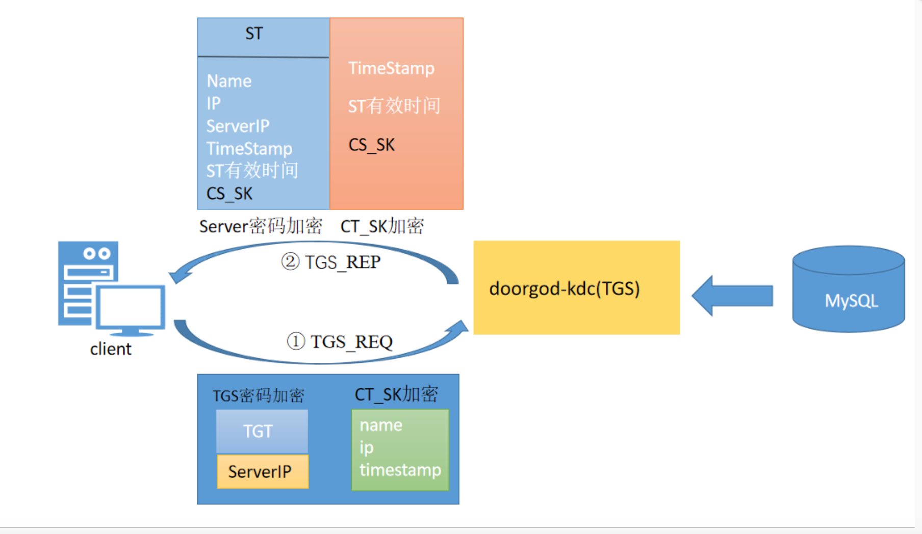 ① 客户端使用CT_SK加密将自己的客户端信息发送给KDC,其中包括客户端名,IP,时间戳;